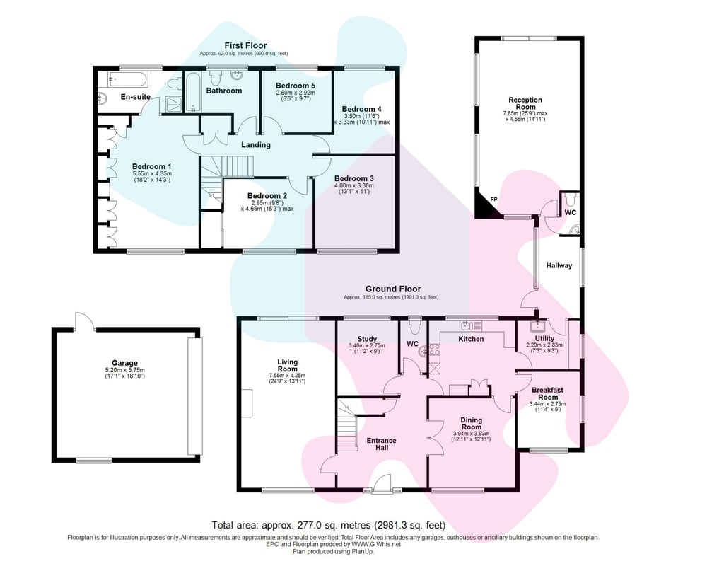 In terms of accommodation there are five double bedrooms, two bathrooms (including an en-suite bath and shower room). To the ground floor there is a spacious reception hall leading to the double aspect living room (approx 25ft x 14ft), dining room, study, cloakroom, rear aspect kitchen, breakfast room and a utility room.