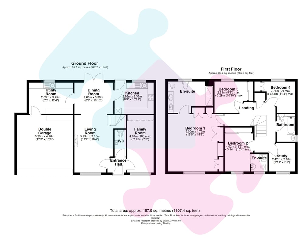 On the first floor there is a full galleried landing leading to five bedrooms and a family bathroom. The main bedroom measures 16ft x 15ft and has a range of built in furniture. There is also a stunning and luxurious fully tiled en-suite shower room with his and her's wash basins, bidet, walk in power shower and underfloor heating. The second bedroom (originally built as the principal bedroom) also has built in wardrobes and another re-fitted en-suite shower room. Two further bedrooms have built in wardrobes and the fifth bedroom currently acts as a study.