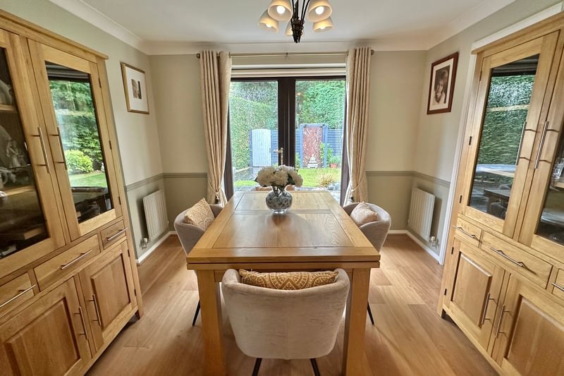 Downstairs there is a study/family room to the right and a refitted cloakroom. To the left there is the main living room with a flame effect recessed electric fire and an opening to the dining room which has double patio doors leading to the garden. There is a re-fitted kitchen with a range of built in appliances, ceramic hob, concealed wall hung gas fired boiler and larder fridge. The whole house has softened water supplied by an under-sink water softener. To the left of the dining room is an over-sized re-fitted utility room with a door into the double garage which has an insulated electric roller door, LED lighting and a range of electrical sockets.