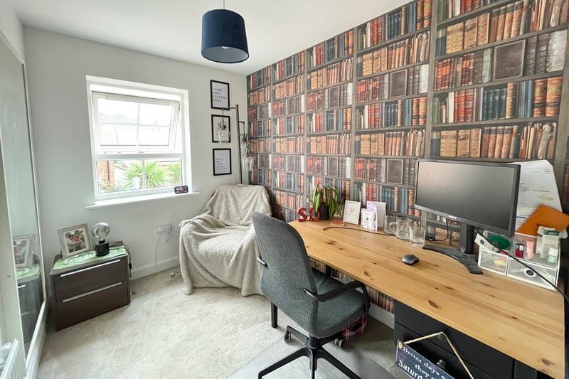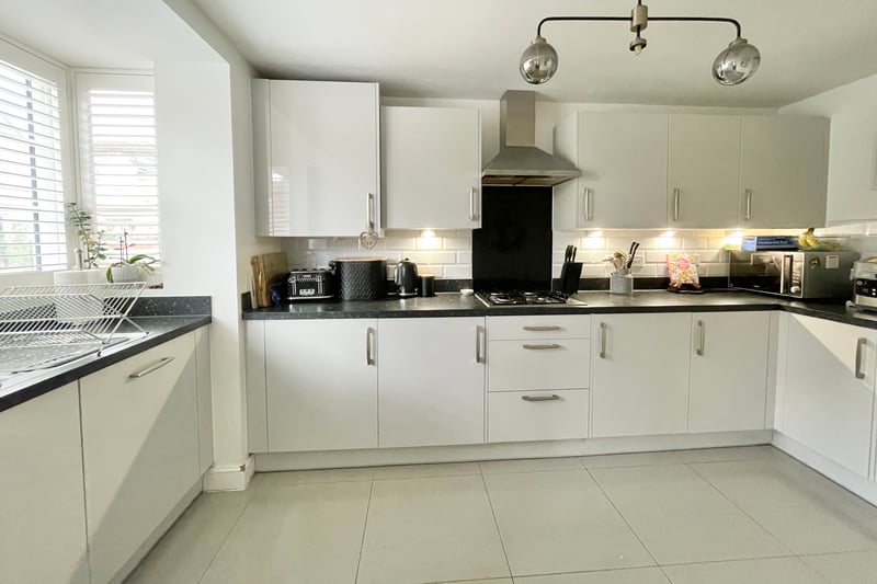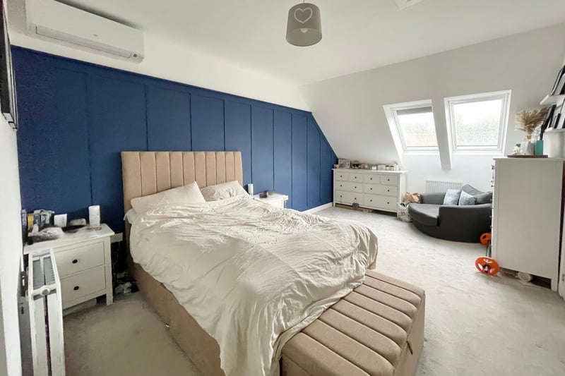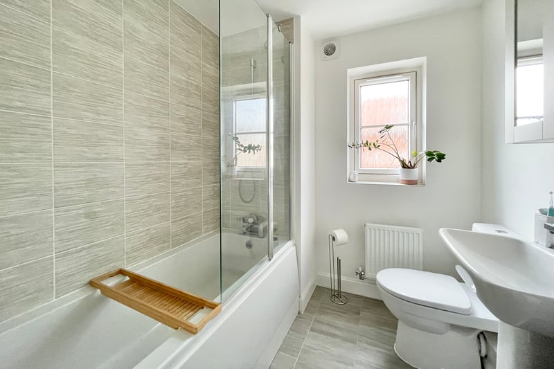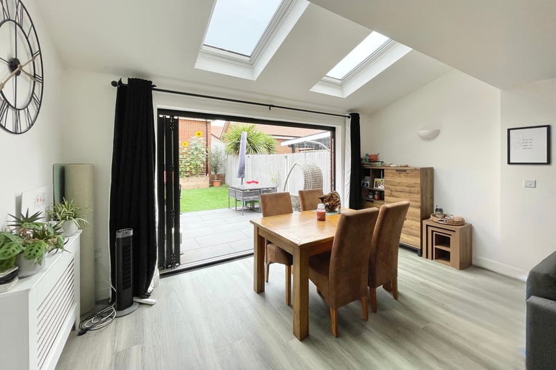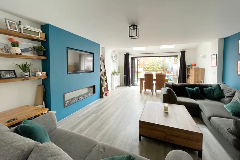Accommodation downstairs comprises; a welcoming entrance hall with a downstairs cloakroom, a stunning, open-plan living space with media wall and a built-in, stylish electric fireplace. There are skylights in the vaulted ceiling and bi-fold doors across the rear of the home providing open access to the secluded rear garden, a large modern kitchen with bay window and fitted window shutters.