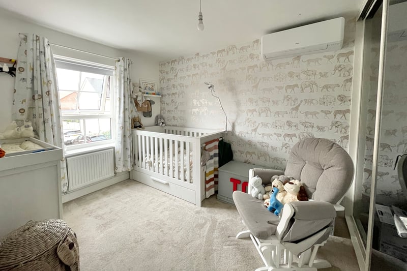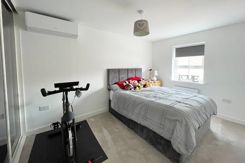 On the first floor are three bedrooms, two of which are generous double rooms with integrated, mirrored double wardrobes and fitted air-conditioning, and a modern family bathroom.