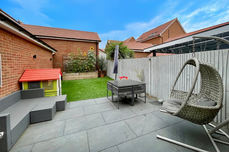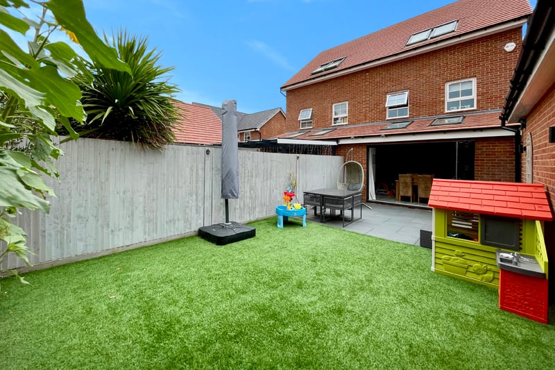 Outside, the rear garden is south-westerly facing, and it is worth noting how secluded the garden is. It is landscaped with artificial turf and a designated patio area, perfect for relaxing and entertaining and there is also outdoor lighting. The garage has power and lighting. The block-paved driveway offers parking for several vehicles and there is a fitted EV point installed.
