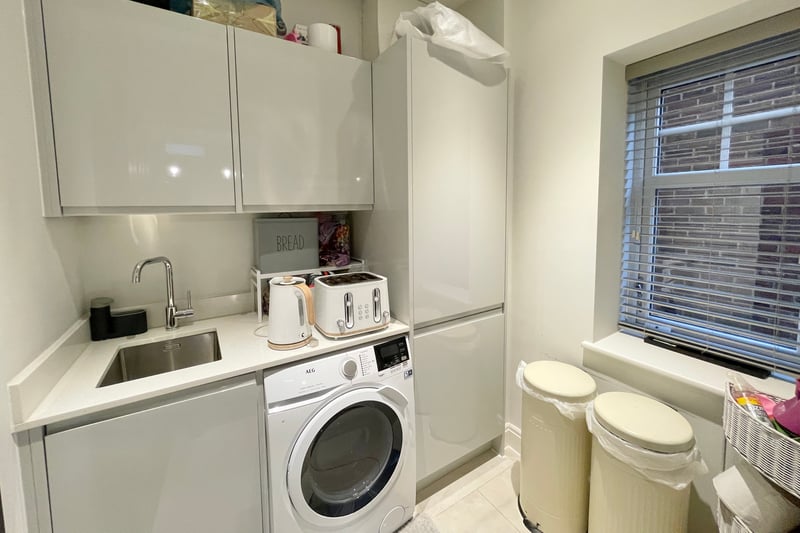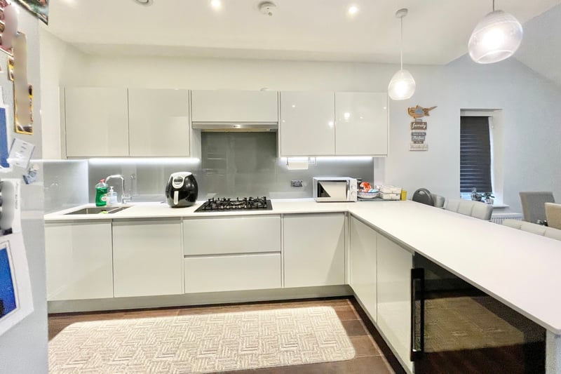 Accommodation on. The ground floor comprises; a spacious and welcoming entrance hall with double doors leading through to the main living room located at the front of the house. The living room is dual aspect and features a bay window overlooking the water fountain and also has a central feature fireplace. To the rear of the home is a large three-zone, open-plan living space including sitting, dining areas and a contemporary style kitchen with a utility room. The kitchen has composite worktops, breakfast bar, Bosch and Smeg appliances and a wine fridge. The open-plan living space also has a vaulted ceiling and double doors leading to the large rear garden.