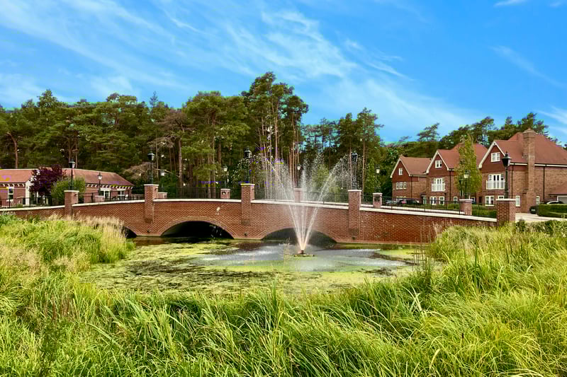 Upstairs on the first floor are three double bedrooms, all with ensuites, and a study which could be used as a sixth bedroom. The main bedroom boasts a walk-in wardrobe and a Juliette balcony overlooking the green and water fountain to the front.